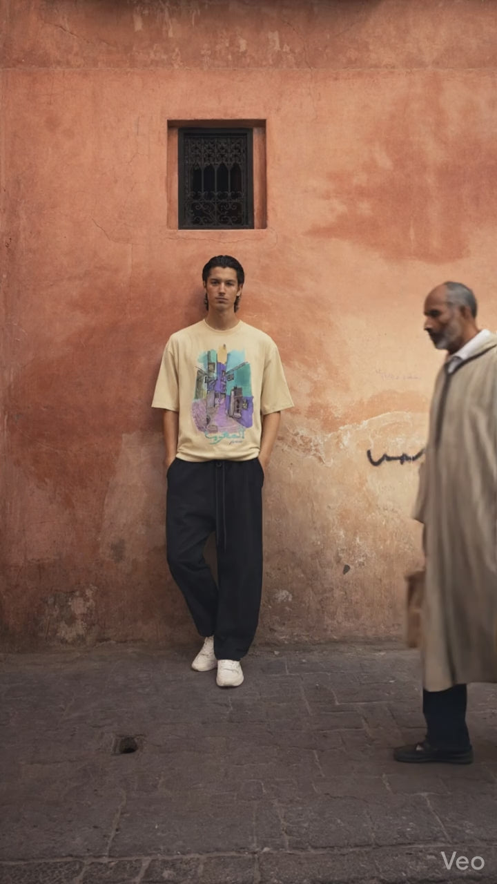 Visuels d’artiste inspirés du patrimoine marocain : typographies, motifs et clins d’œil discrets. T-shirts oversize en coton lourd , impressions giclée/sérigraphie pour un rendu précis et durable.